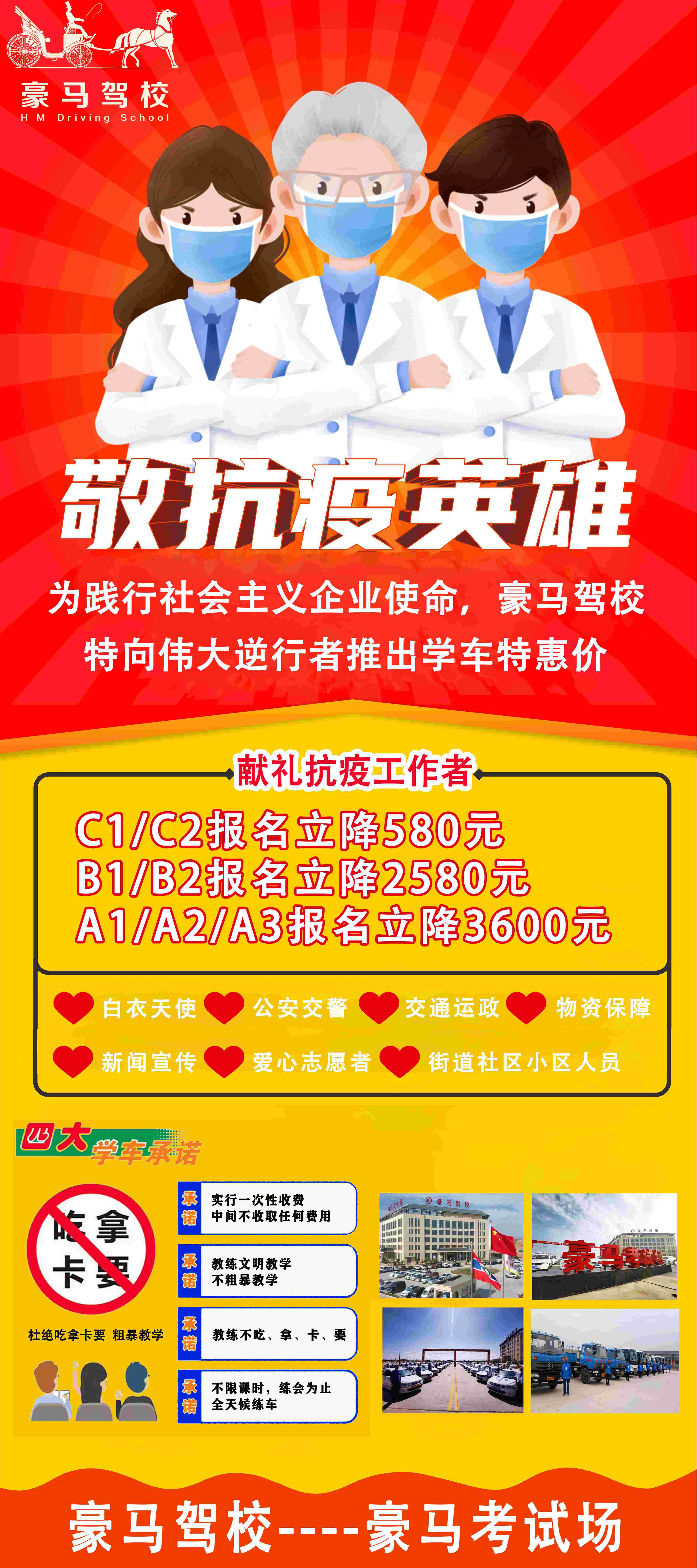 甘肅豪馬汽車(chē)科技有限公司是一家集駕駛員培訓(xùn)、考試為一體的大型綜合性服務(wù)基地,位于蘭州新區(qū)趙家鋪立交橋向西200米,一期占地面積620畝。駕校開(kāi)設(shè)A1、A2、A3、B1、B2、C6、C1、C2、D、E各車(chē)型駕駛員培訓(xùn)及考試業(yè)務(wù),是省內(nèi)規(guī)模最大、設(shè)施設(shè)備最齊全的駕校之一?;貎?nèi)有百余輛全新大中小型車(chē)輛及考試設(shè)備、訓(xùn)練場(chǎng)、考試場(chǎng)、模擬城市道路、餐飲、公寓等配套設(shè)施設(shè)備,是每位學(xué)員訓(xùn)練考試的理想之地,豪馬駕校始終堅(jiān)持“以人為本、誠(chéng)實(shí)守信、服務(wù)大眾、嚴(yán)格自律”的經(jīng)營(yíng)理念,讓學(xué)員明明白白的消費(fèi),開(kāi)開(kāi)心心學(xué)車(chē)。... <查看更多>